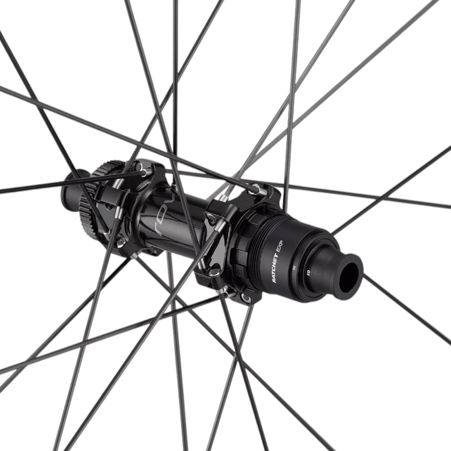 Os raios Vonoa Carbon com peças de extremidade de titânio, em 20 unidades com tração reta, reduzem o peso e aumentam a resistência, enquanto o padrão de amarração duas cruzes/duas cruzes melhora a rigidez lateral. Compatível com sistema tubeless, a roda inclui válvula Roval de 34mm e suporta pressões máximas de 40psi, sendo ideal para pneus como Fast Trak ou Renegade.