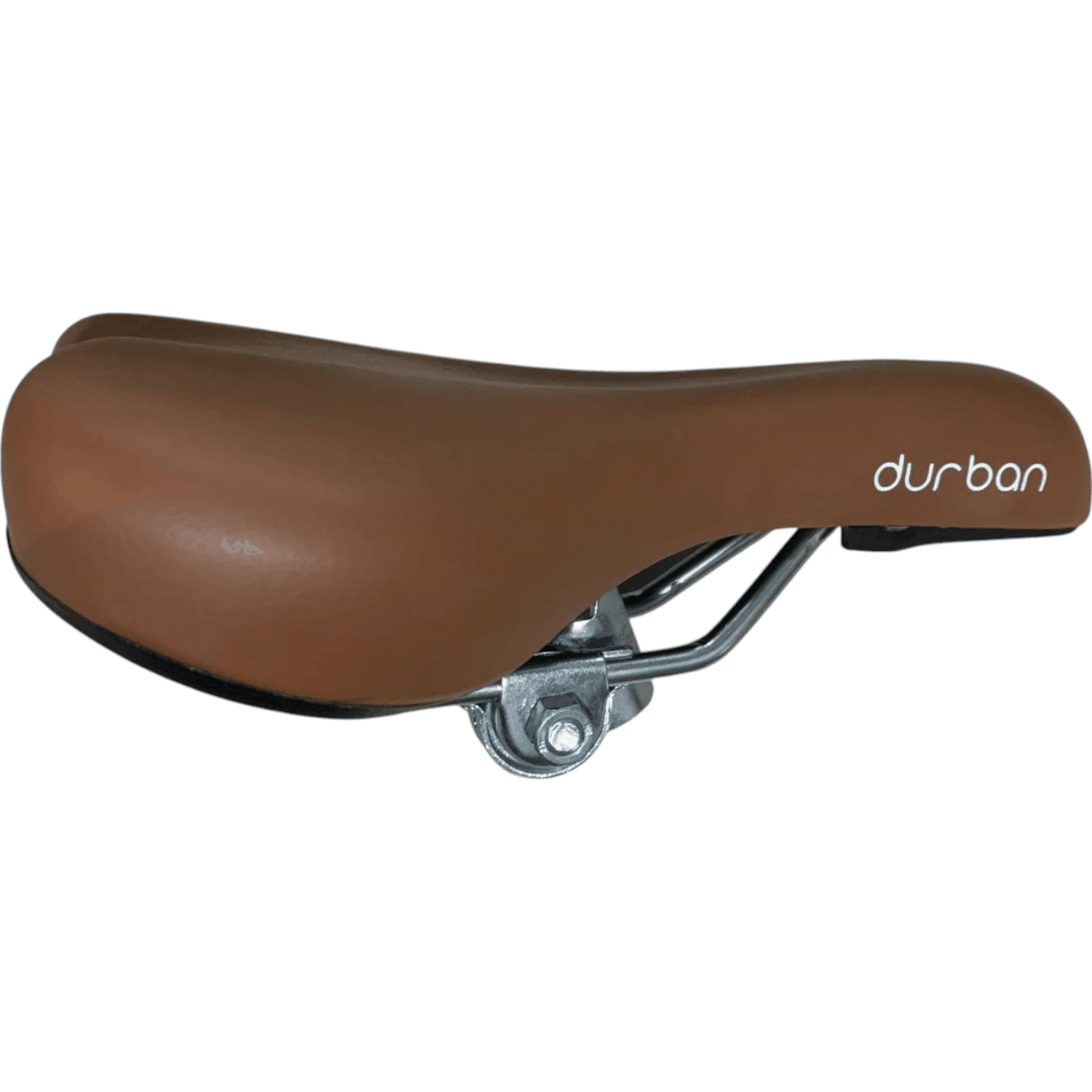 Disponível em diversos designs, o selim Durban varia em largura (geralmente entre 140-150 mm) e comprimento (cerca de 270-280 mm), adaptando-se a diferentes posturas de pilotagem, como upright ou mais agressiva. Alguns modelos, como o usado na Sampa Pro, possuem acabamento simples com acabamento em vinil e reforço interno, pesando aproximadamente 300-400 g, ideal para bikes dobráveis ou de entrada. A marca também destaca-se por incluir refletores ou tiras refletivas em certos designs, aumentando a visibilidade noturna.