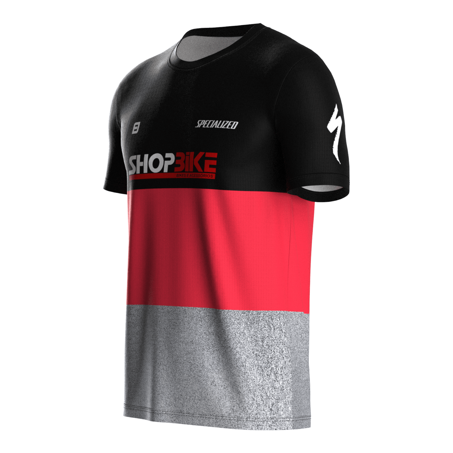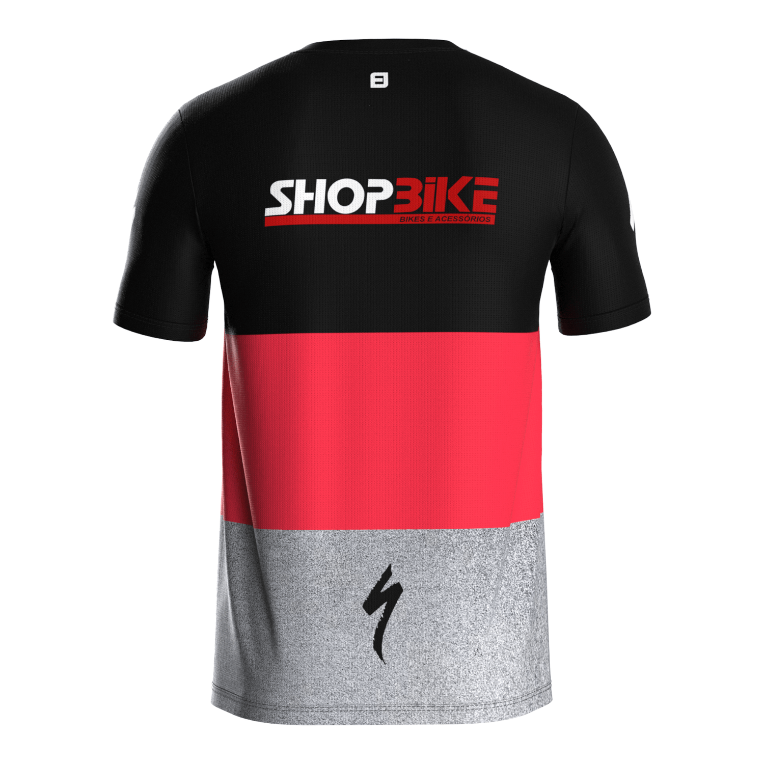 Além disso, conta com zíper frontal integral para ventilação personalizada, três bolsos traseiros funcionais para levar géis, ferramentas e acessórios, e tratamento antimicrobiano que evita odores indesejados. O visual em preto, cinza e vermelho reforça a identidade da Shopbike com modernidade e esportividade.